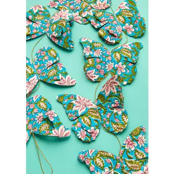 From an exciting range of eco friendly, recycled decorations entirely hand crafted in beautiful block print designs of bold colour. Both sides of this butterfly vertical garland display the pretty lily pattern. Eight three dimensional butterflies are attached by a thin gold thread running through the centre of each and completed by a small gold coloured metal bee decoration at the base of the garland. Suitable for all kinds of celebration and creating funky room designs. 13.5 x 120cm Recycled cotton pape