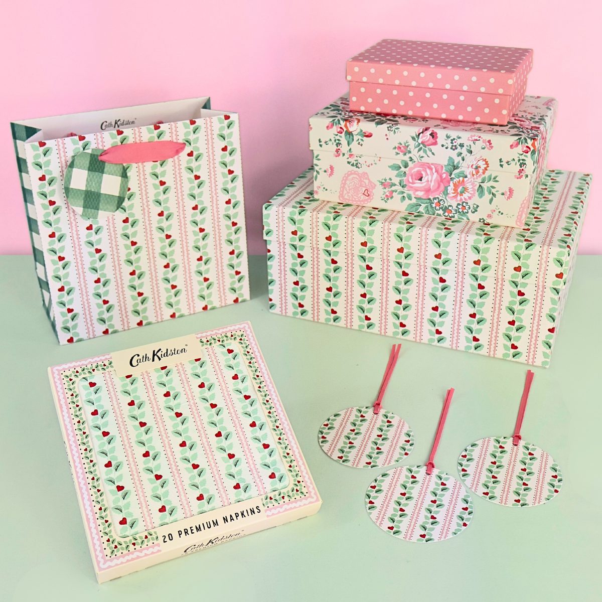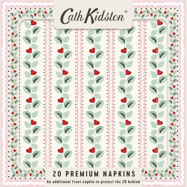 British design and officially licensed Cath Kidston paper napkins in a pink and green Heart Vine design. This set of 20 is ideal for dinner parties, birthday celebrations and special occasions. Featuring eco-friendly plastic-free packaging, each pack includes one extra napkin (21 total) in place of a plastic covering. decorative disposable napkins. Made from responsibly sourced materials these 3-ply tableware napkins are sure to impress. Each is 33cm x 33cm.