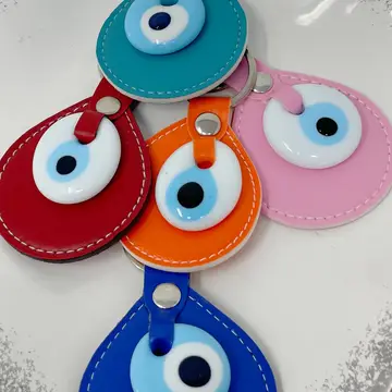 Faux leather and glass evil eye oval keychain a Comes in assorted colours
