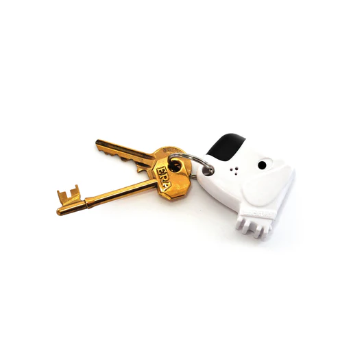 KEY FINDER, DOG – 2 POPSFetch My Keys is a dog shaped key ring designed to fetch your keys (or at least alert you to where they are) should you lose them down the back of your couch. Whistling sets off a beeper inside the key ring, and causes the dog’s nose to flash, guiding you to them like a good companion should. Materials and environmentalPlastic (ABS)Rigid and tough. Produces hard wearing, long lasting product. RecyclableElectrical and electronic componentsIncludes circuits, electrical wiring, power cords, plugs, lamps, speakers etcMetal (Stainless Steel)Highly recyclable. Will not rust or corrode.Size and weight Item dimensionsWidth: 45mmHeight: 45mmDepth: 12mmWeight: 0.018Kg