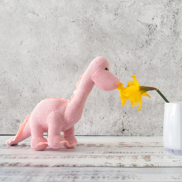 Tactile sweet pink diplodocus dinosaur with a soft rattle. A great new baby gift for young babies. We don’t think that you could get dinosaur toys much sweeter than our organic diplodocus pink baby rattle. Ideal if you are looking for unique newborn gifts or baby shower gifts. Features: – Suitable from birth, machine washable – Size approx. 21cm x 24cm x 9cm – Ethically sourced – Organic cotton knitted fabric stuffed with recycled polyester fill. – Safety tested UKCA / CE