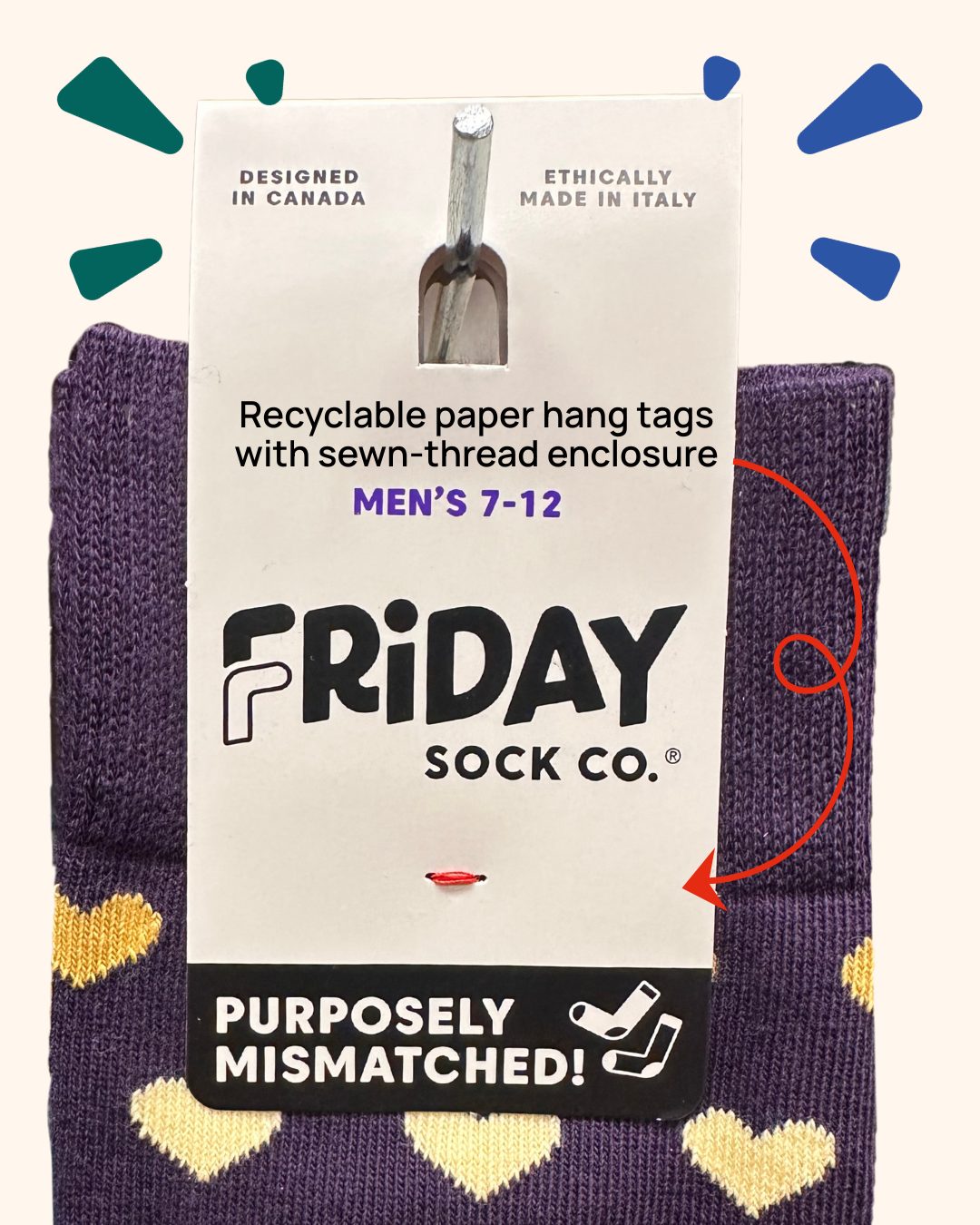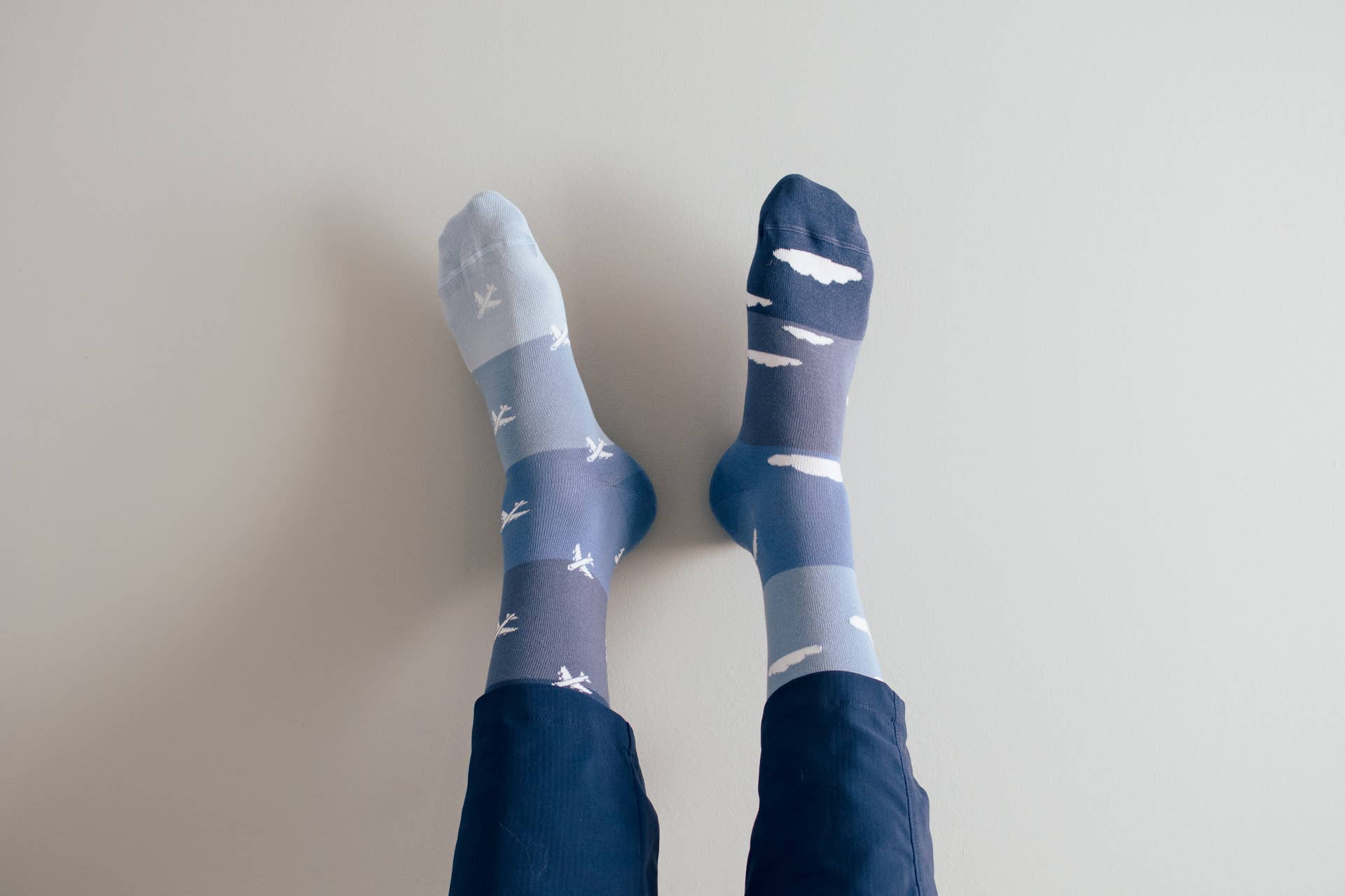 Men’s Plane & Cloud Socks combine whimsical airplane and cloud graphics with intentionally mismatched patterns and premium certified cotton for lasting comfort and appeal. Made in Italy and designed in Canada, they make a fun addition to boutique assortments, travel displays, and specialty sock collections.