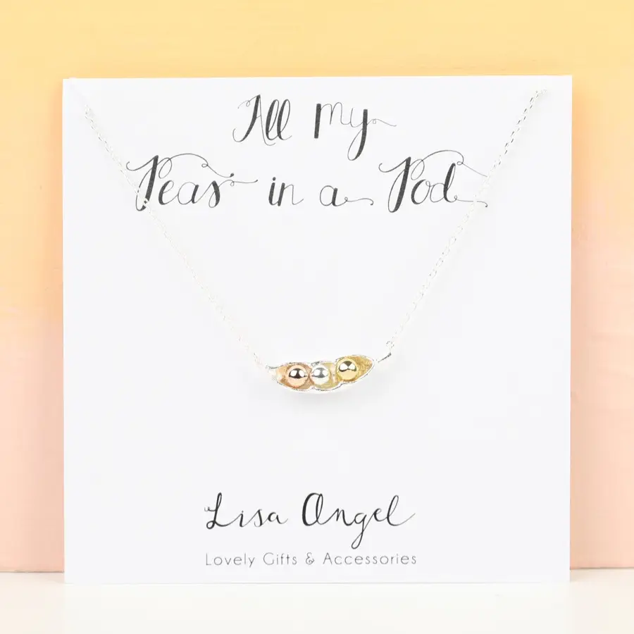 A sentimental piece to represent the peas in your little pod. 3 mixed metal peas in a silver pod to represent your loved ones. Hanging from a delicate silver plated fine trace chain. With a lobster clasp and extender chain to secure. Made from pure silver, 18ct gold and 18ct rose gold plated metal. From the Lisa Angel Delicate Collection.