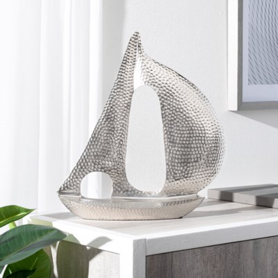 Add a nautical appeal to any room with this contemporary aluminum sailboat decorative sculpture. Featuring a hammered finish and three dimensional appeal, this piece will stand out on a shelf or mantel in the living room or den. It would also make a great gift for any sailing enthusiast!