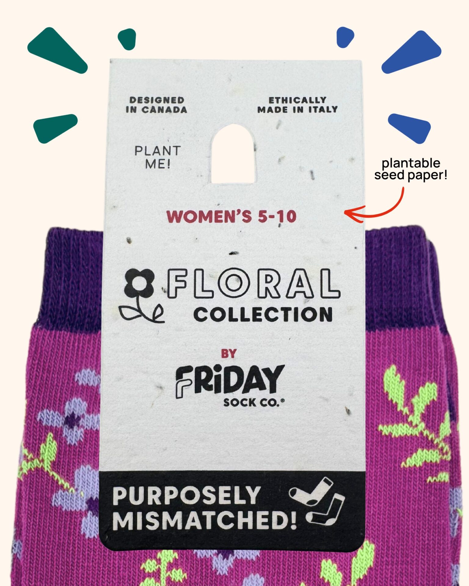 Each pair of socks from our Floral Collection comes with a plantable seed paper hang tag. Put into a pot with soil, add water and sunlight, and watch your very own wildflowers start to grow!