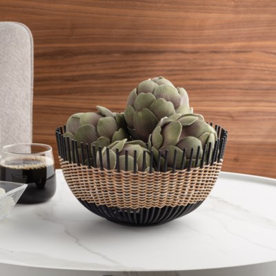 Add interest to your space with this black metal decorative accent bowl. Wrapped with a rattan weave, this bowl is ideal as a centerpiece or on a shelf or table.